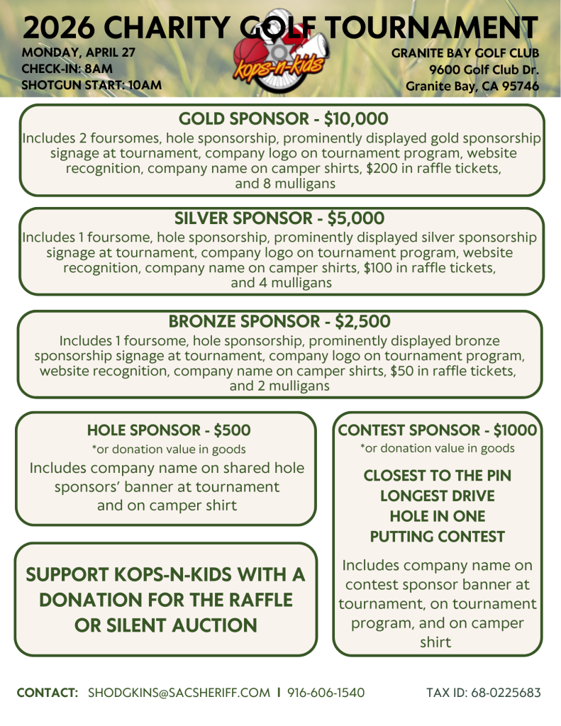 It’s that time of the year again. The registration for our 2026 Kops-n-Kids Charity Golf Tournament is open. This year’s event is on Monday, April 27th, 2026, and will be hosted at the Granite Bay Golf Club. Please consider becoming an event sponsor and helping to support the amazing work done by Kops-n-Kids in the Sacramento community. Review the attached flyers for registration and sponsorship details.